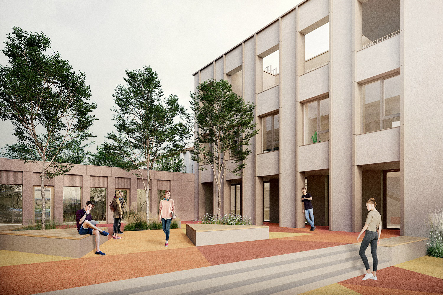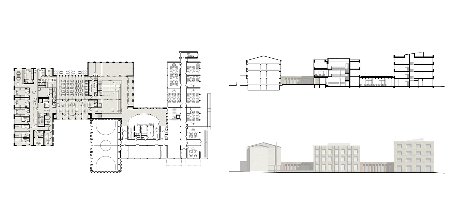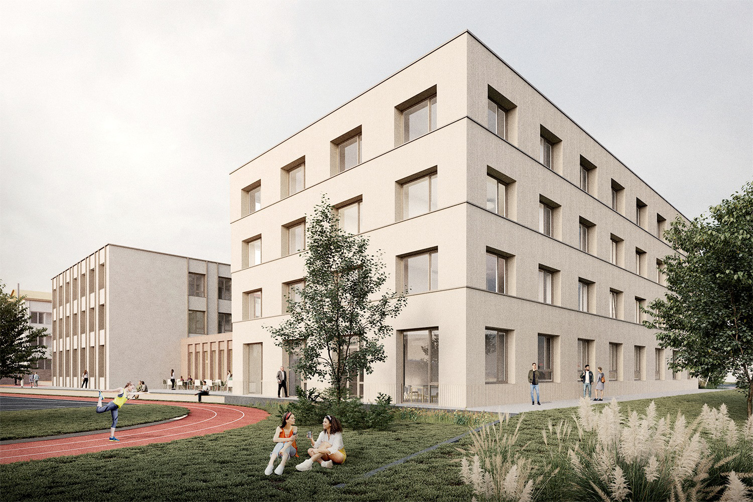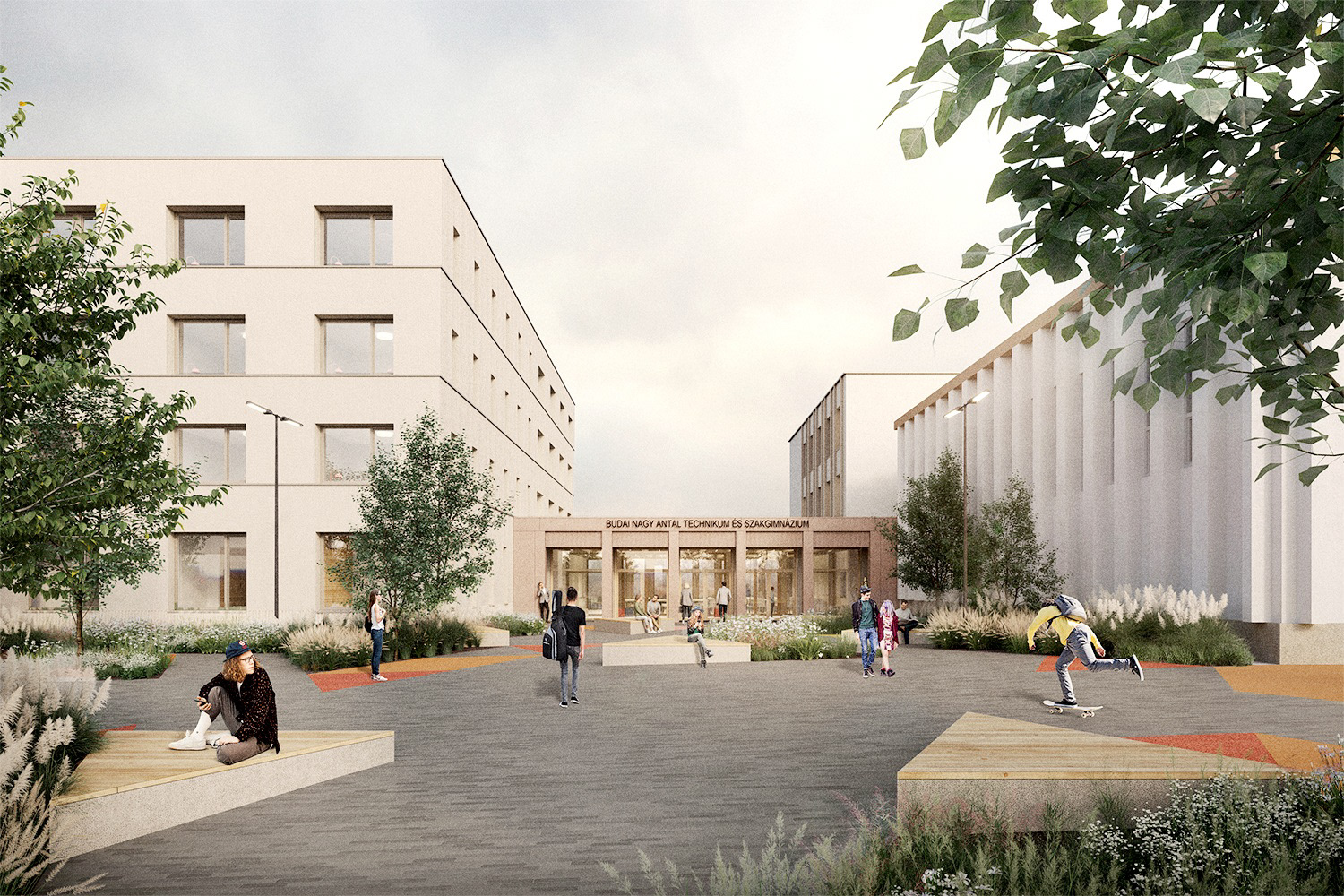 Changing conditions in an existing school and the lack of certain functions prompted the need to expand the institution. The school will become complete with a new assembly hall, classrooms and canteen, as well as a dormitory building. The existing mass of the school building and gymnasium block will be complemented by the new school mass and the cube of the dormitory. The single-storey building section connecting the masses of the complex will form the transport axis organically linking the different phases and functions. The school's new entrance, facing the main road of the city of Nagykálló, proclaims the complex's place among the educational institutions of the future.