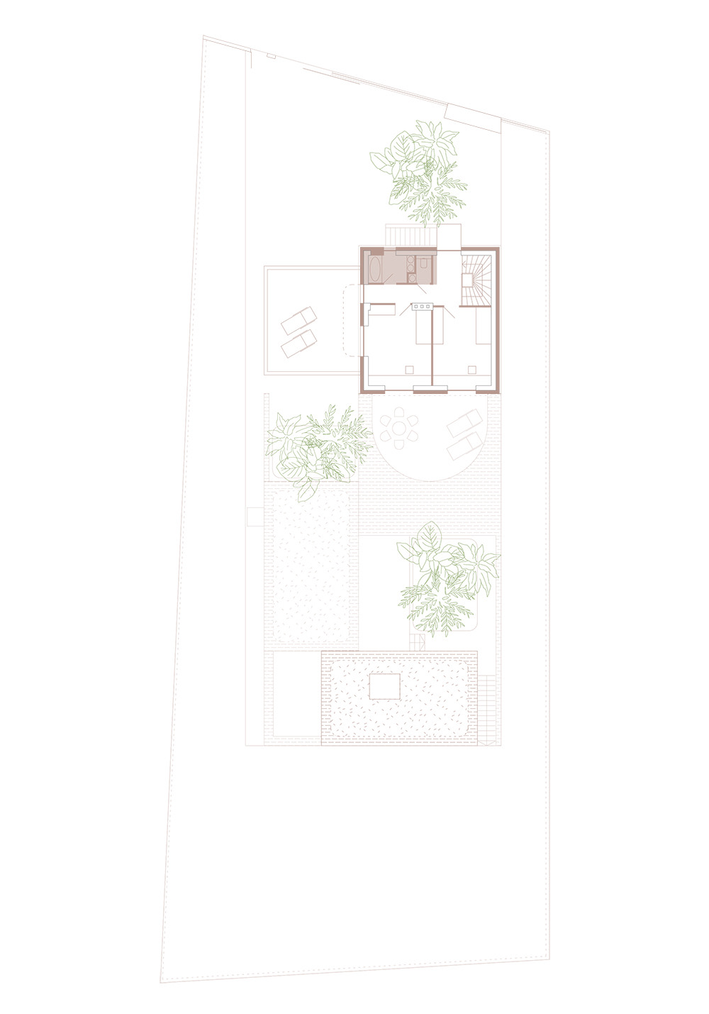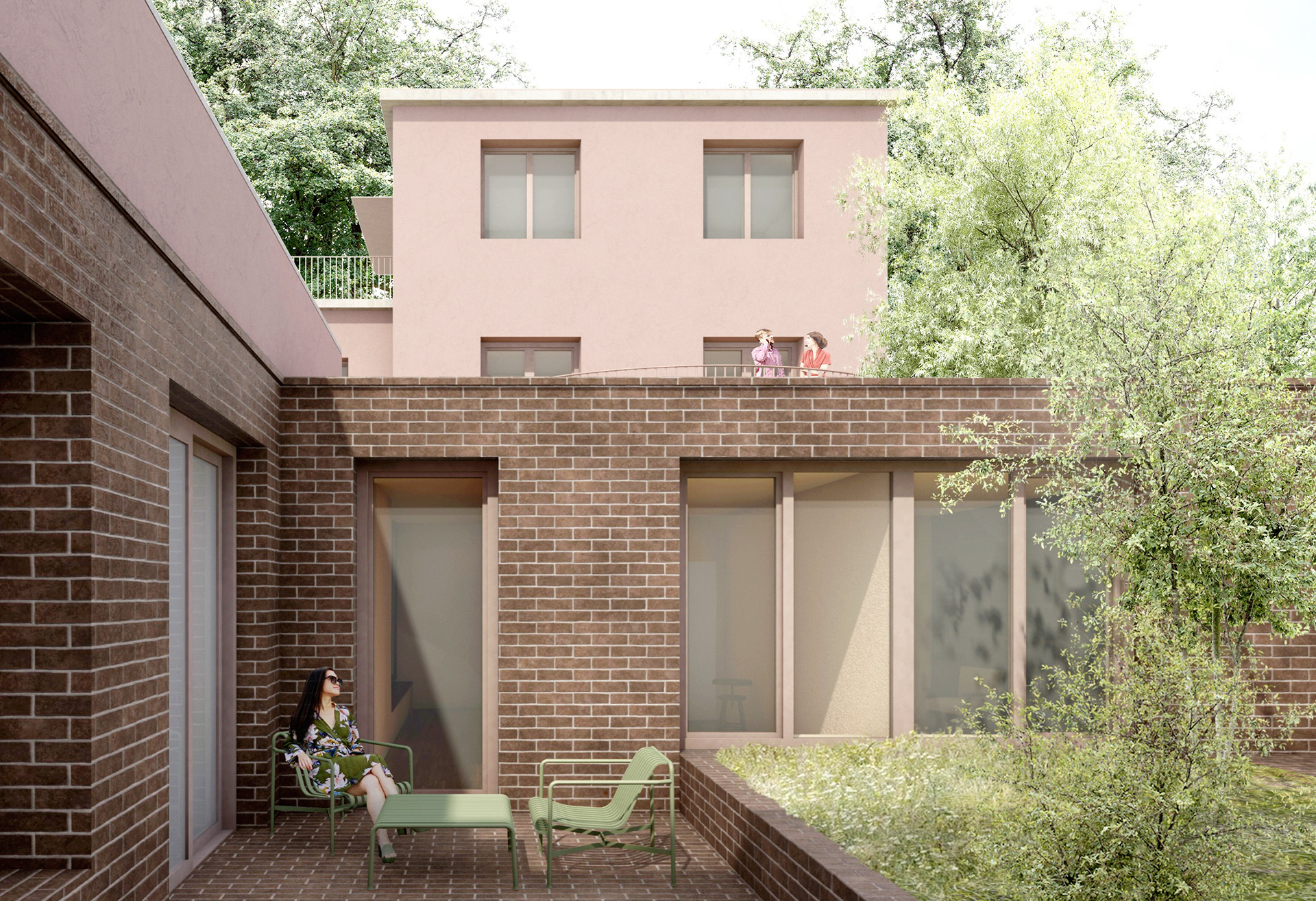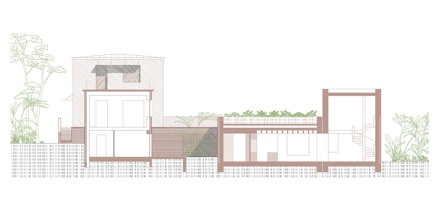 Árkay Bertalan házának felújítását és továbbtervezését, bővítését kaptuk feladatul. A meglévő ház rendszerében additív szerkesztéssel bővítettük úgy a házat, hogy a benne lévő két lakás egymástól zavartalanul működhessen. Ezt úgy értük el, hogy a keresztbe lejtő terepbe nyomot, tégla lábazati szintbe belső udvarokat helyeztük el. Ez nem csak privát kertrészeket alakít ki, hanem kellőképpen tagolja a házat. A meglévő vakolt kubusokat folytatva, a lábazati zónára két új tömeget terveztünk bővítményként, kellően távol a meglévő háztól. Célunk a meglévő, védelem alatt álló ház oly módon való bővítése, hogy annak minden értéke zavartalanul megmaradjon, érvényesüljön.