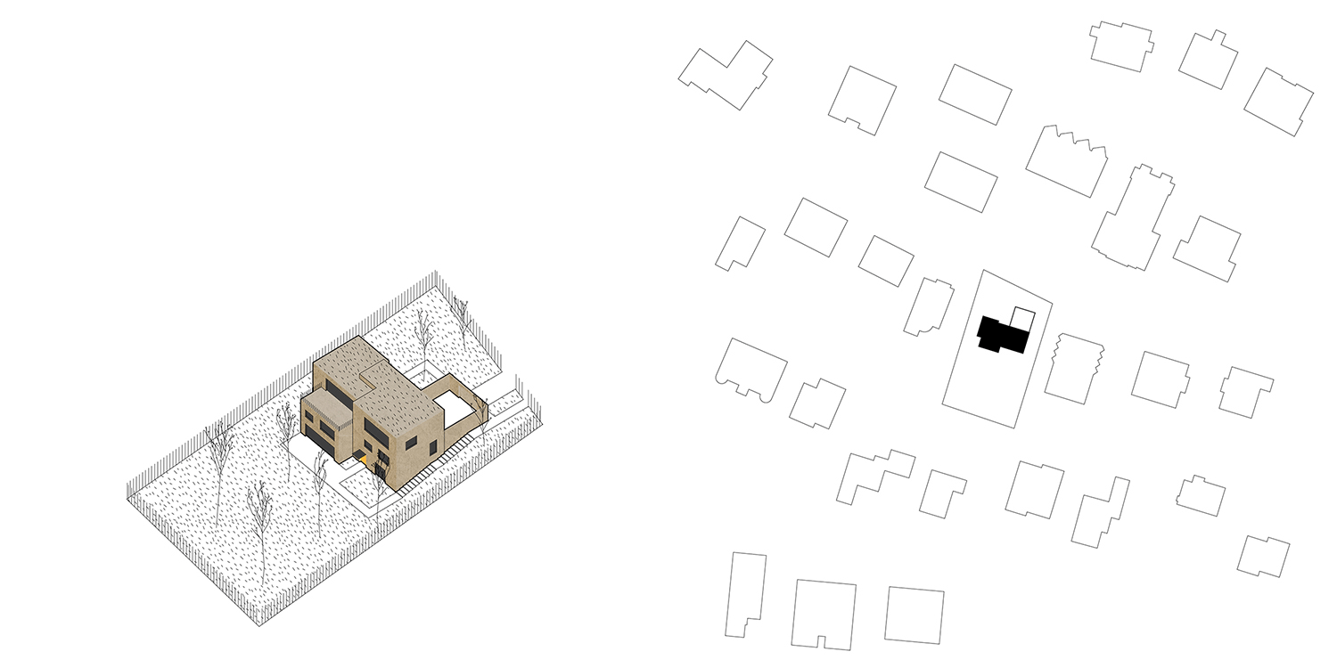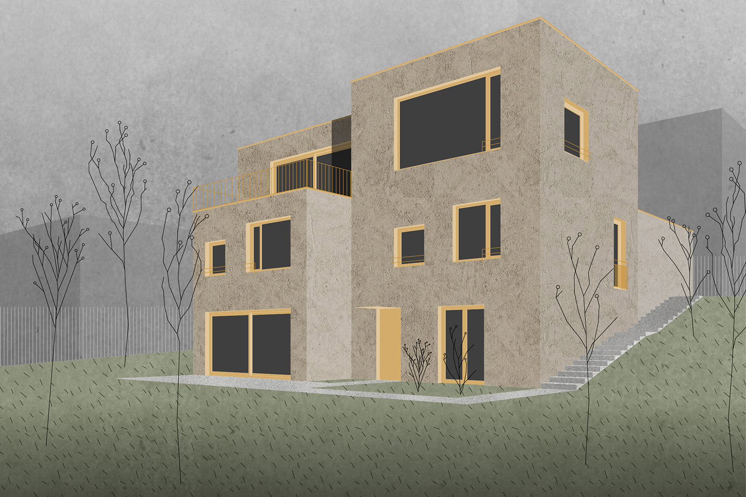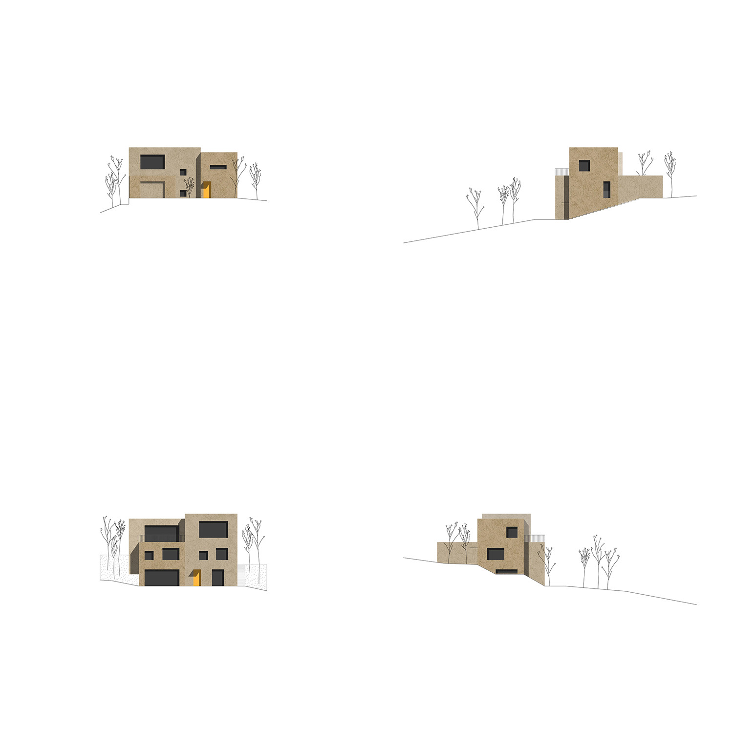 The residential functions of the two-apartment condominium are located on three levels where the lowest level is for car storage. Since the plot can be approached from the road at its high point, it is not possible to use a ramp, we get to the lowest level by car lift. The security walls of the residential units and the car lift form four cubes, creating eventful masses and facades. Height difference of the masses adds to this. Our goal was to create a condominium that fits the modern condominiums of Napvirág Street.