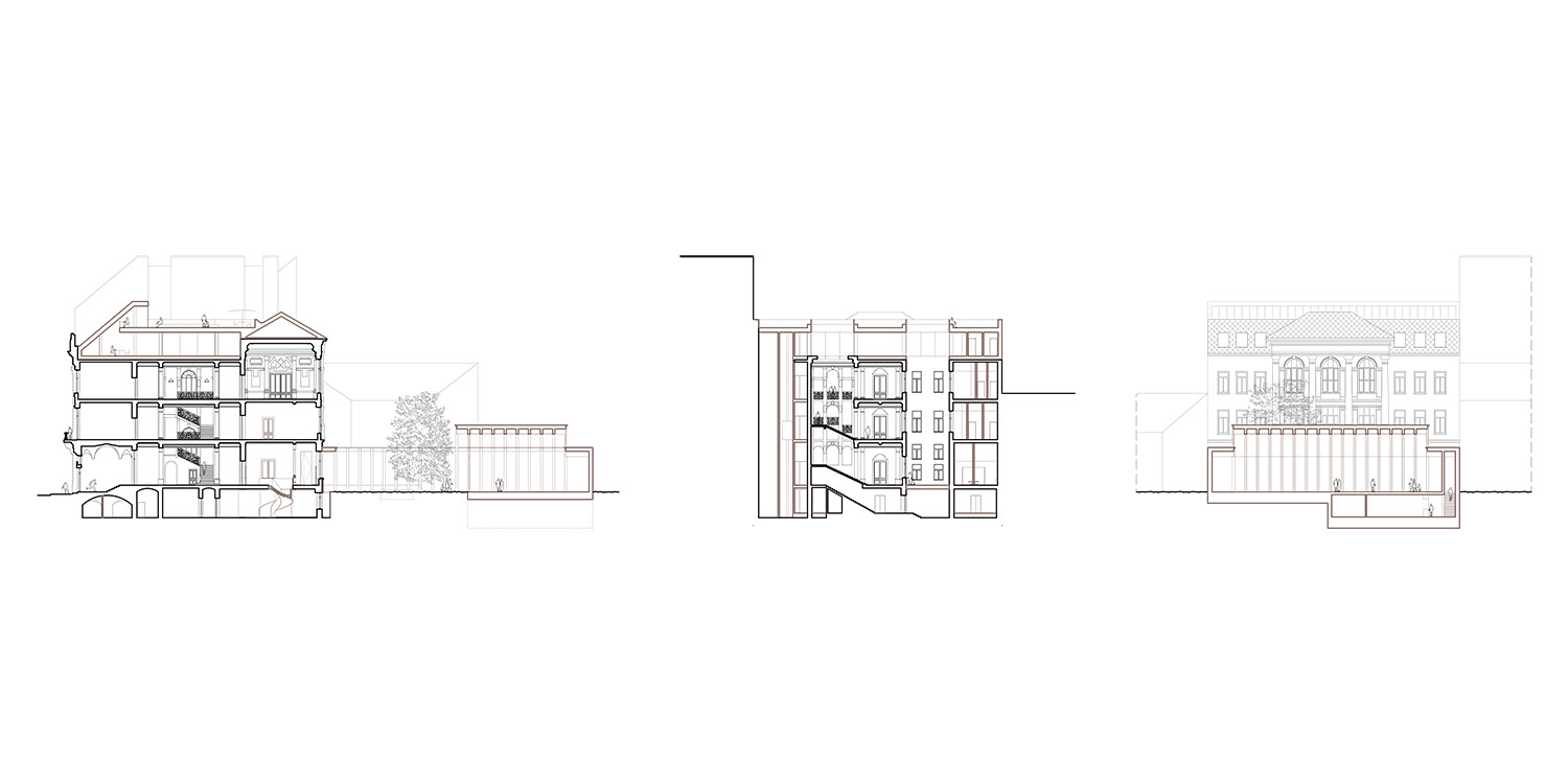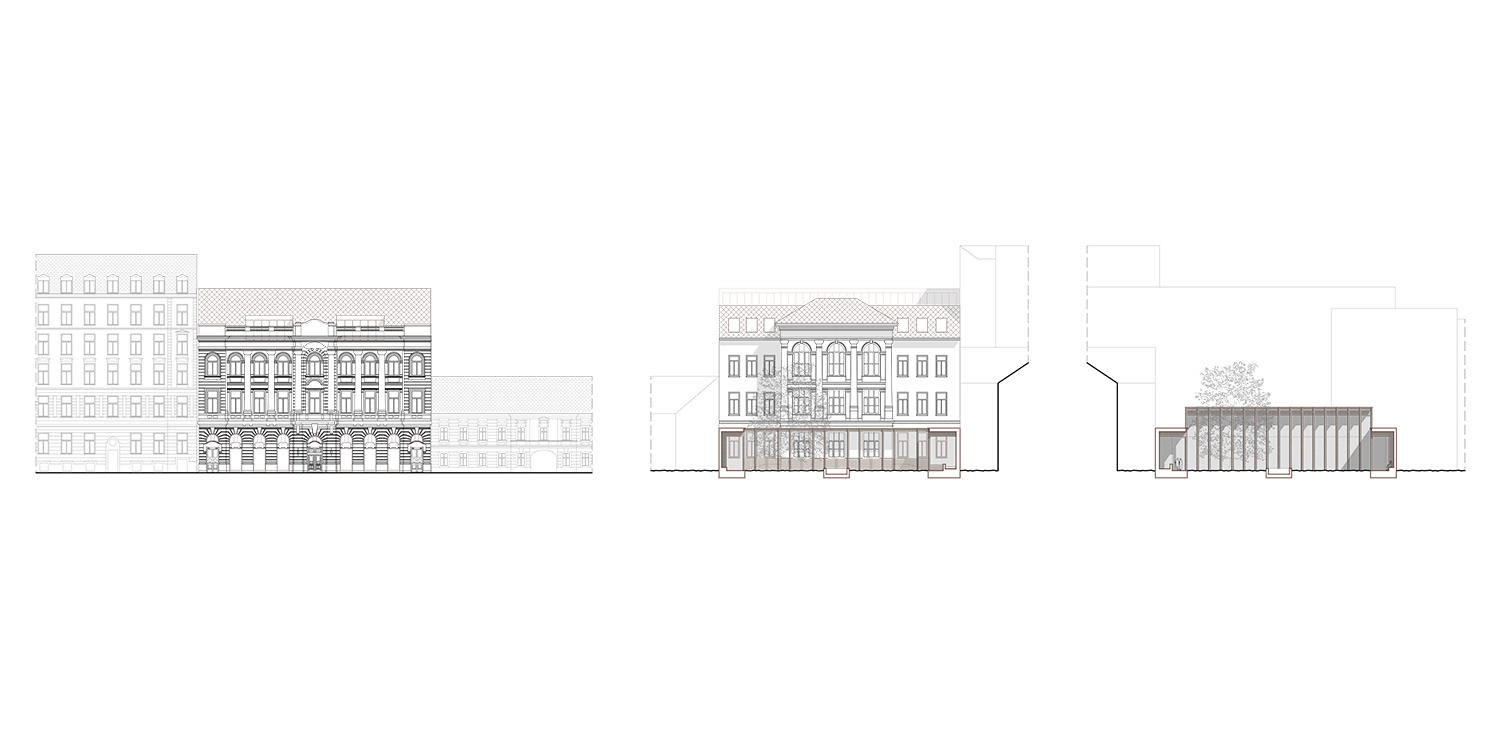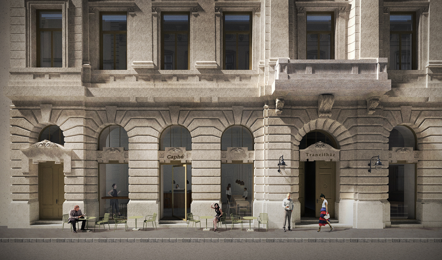 A pályázat célja a Tranzit ház jövőbeni funkcióját kielégítő megújítása, a ház egykori fényének visszaállítása és bővítése. A pályázat legnehezebb feladata a nagyterem helyének megtalálása, melynek befogadására a történeti épület alkalmatlan. Az ezt magába foglaló bővítményt a tömb belsejében, a telek végében kézeltünk el úgy, hogy a meglévő épület és az új épületrész között egy kert is létrejöhessen, mely mind a meglévő házzal, mind a nagyteremmel szoros kapcsolatba kerül. A kertet egy kerengő veszi körül, mely lehetővé teszi a régi és új fedett kapcsolatát.