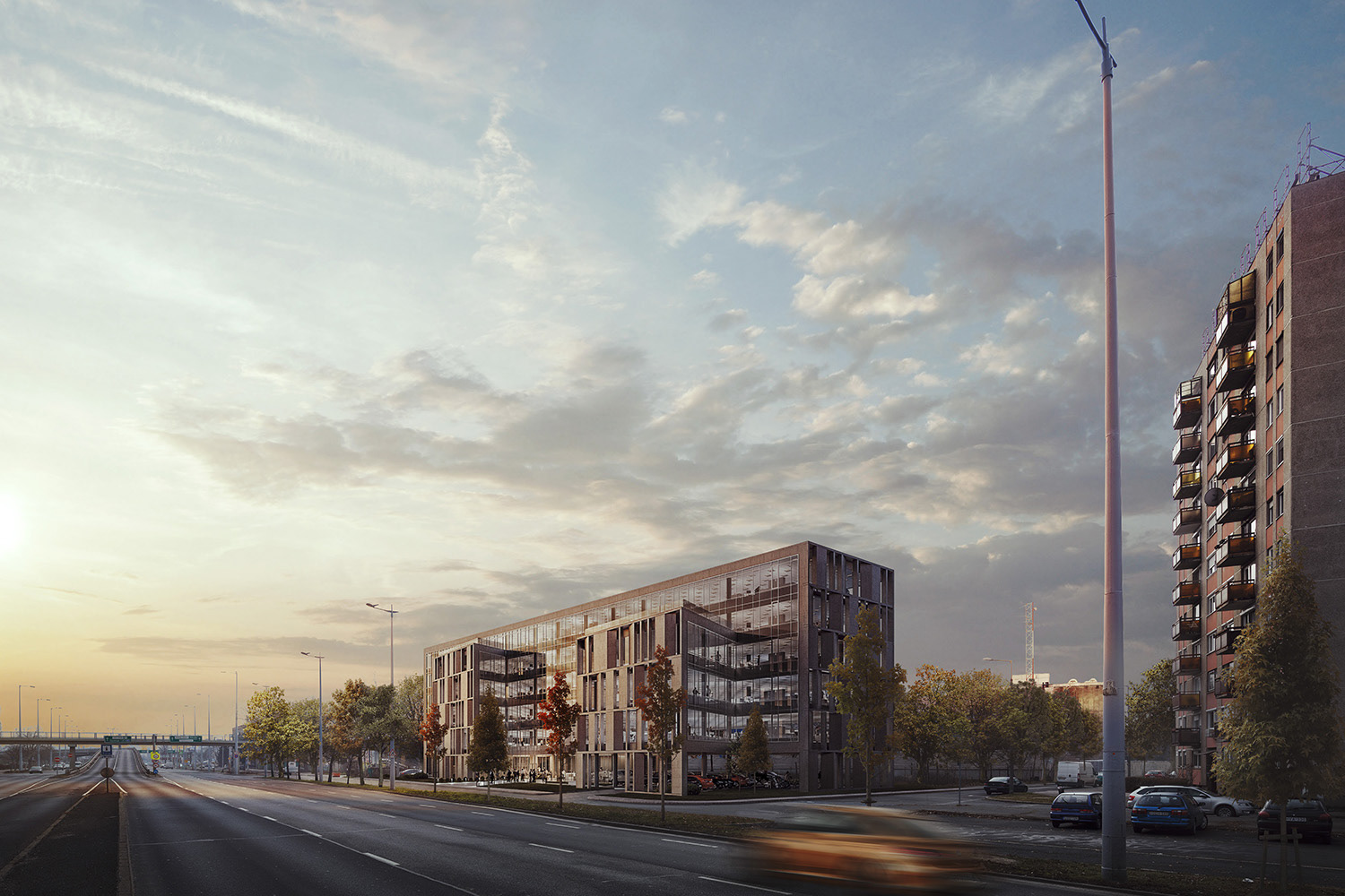 A József Attila lakótelep sarkán elhelyezkedő telekre terveztünk irodaházat az A4 Stúdióval közösen. Az útra merőleges tömegeket a József Attila lakótelep pontszerű házainak telepítése határozta meg. Ezt a két kubust az Üllői úttal párhuzamos tömeg köti össze. A ház jellemzően üveg homlokzatait az irodaház hat bütüjének beton burkolata színesíti. A ház építési engedélyt kapott.