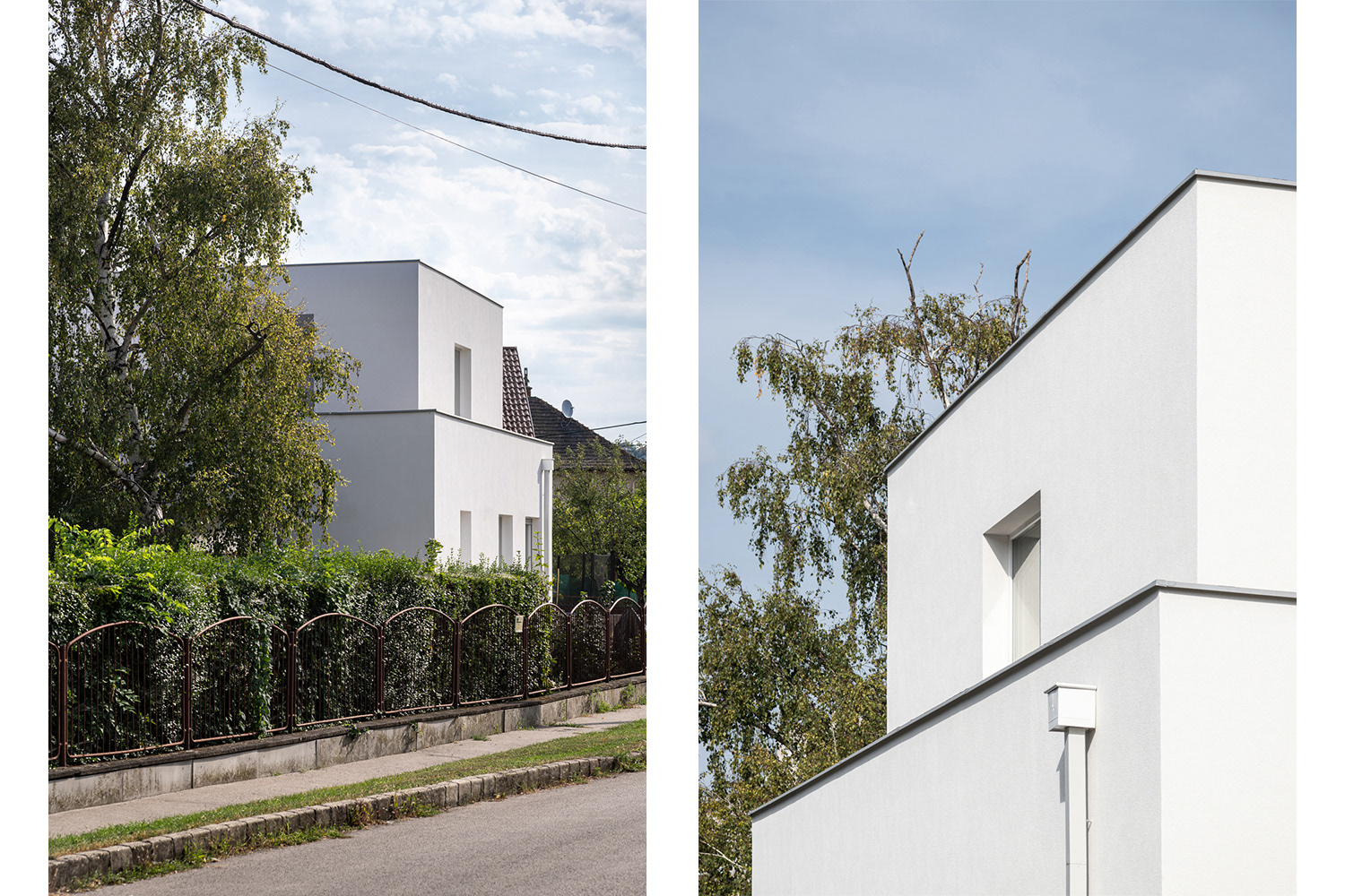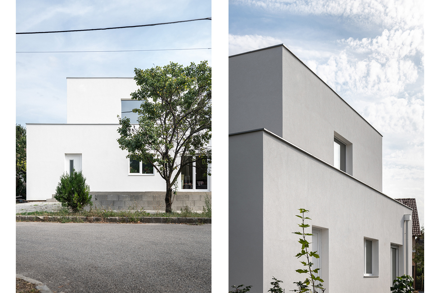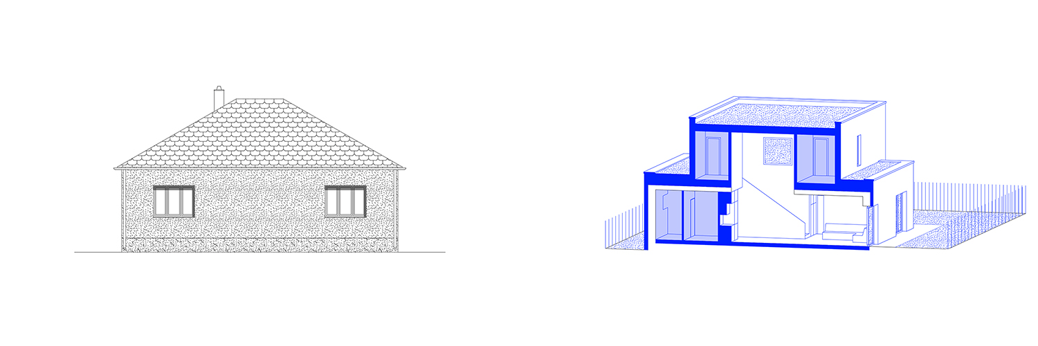 Csilla and Zsombor contacted our office to expand their existing house. Keeping the ground floor contour unchanged was an important consideration as the plot was overbuilt and the additional square meters gained by acquired rights were claimed by the investors. It was also an interesting starting point to define the construction area, as the house in the twin-style building zone does not have a pair. Defining the front garden, side garden and back garden together with the construction department, it was recognized that the three boundary walls of the ground floor were located outside the construction site, so the reconstruction of the planned high-pitched roof proved to be an impossible solution. A new lightweight level that cannot be built on existing load-bearing walls has been designed as an extension with a connection to the ground floor mass with a large airspace. The final mass formation is a good example of when the rules draw the house. The plastered masses are new, fresh spots on the street.