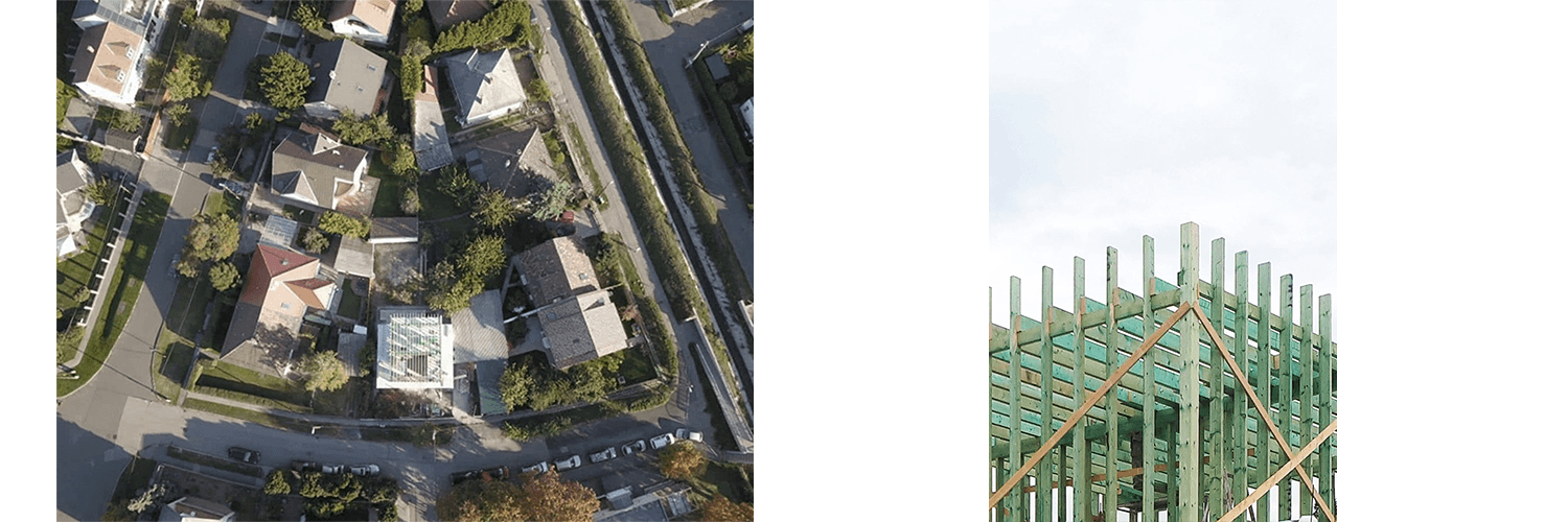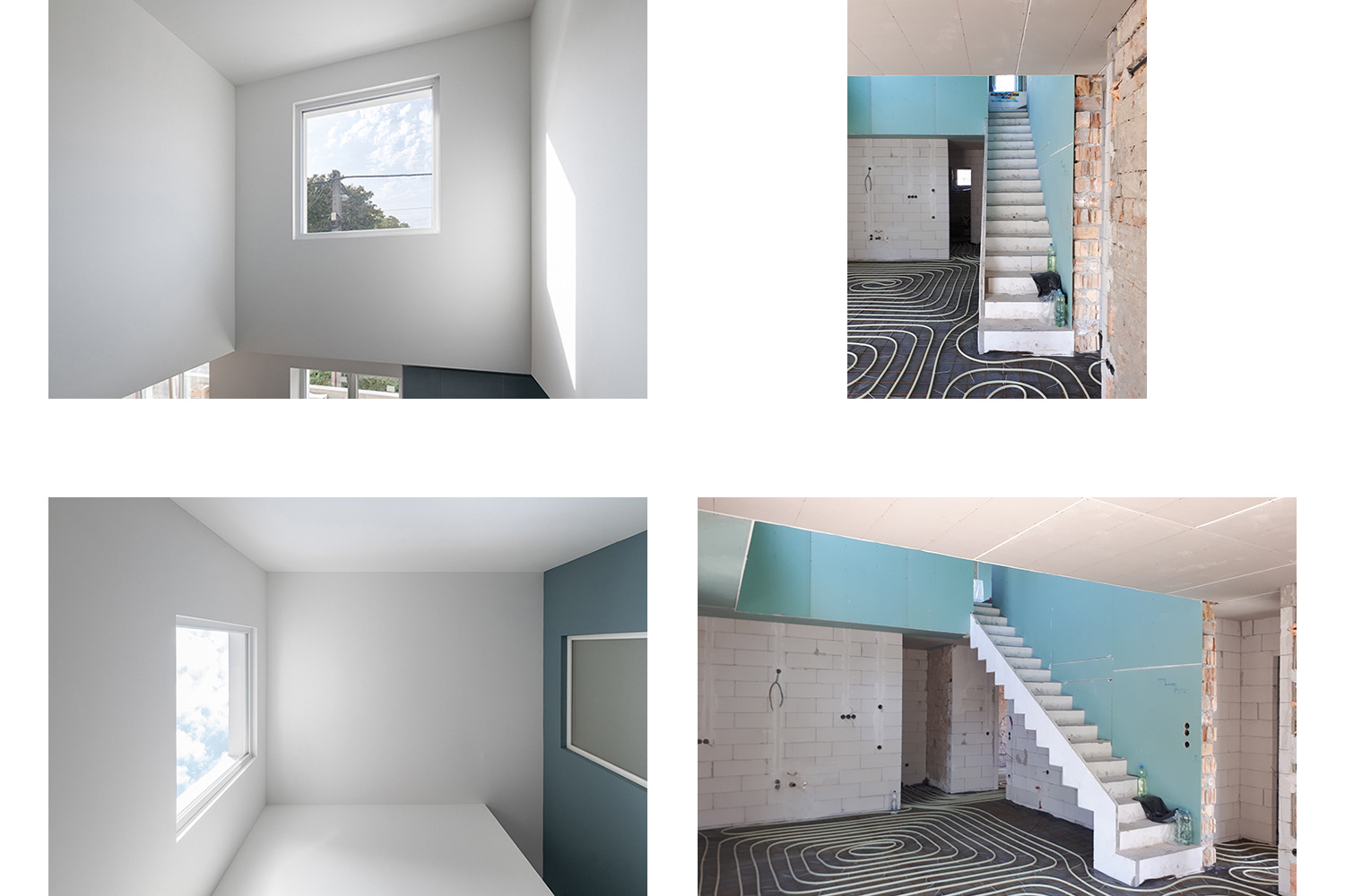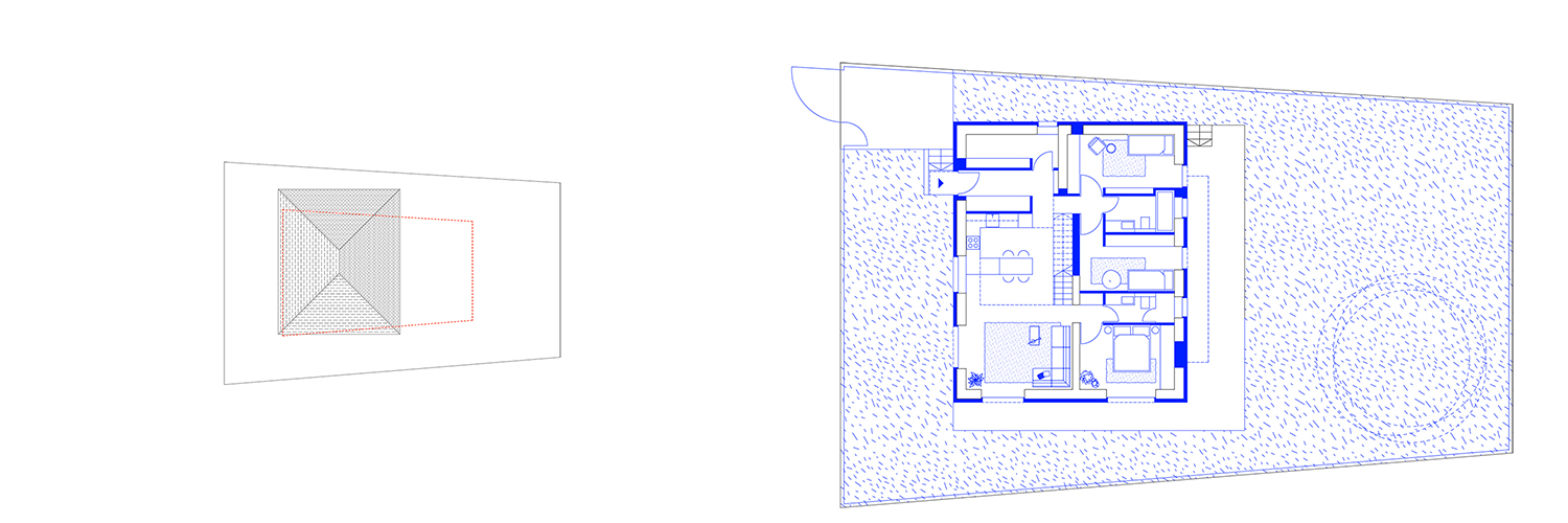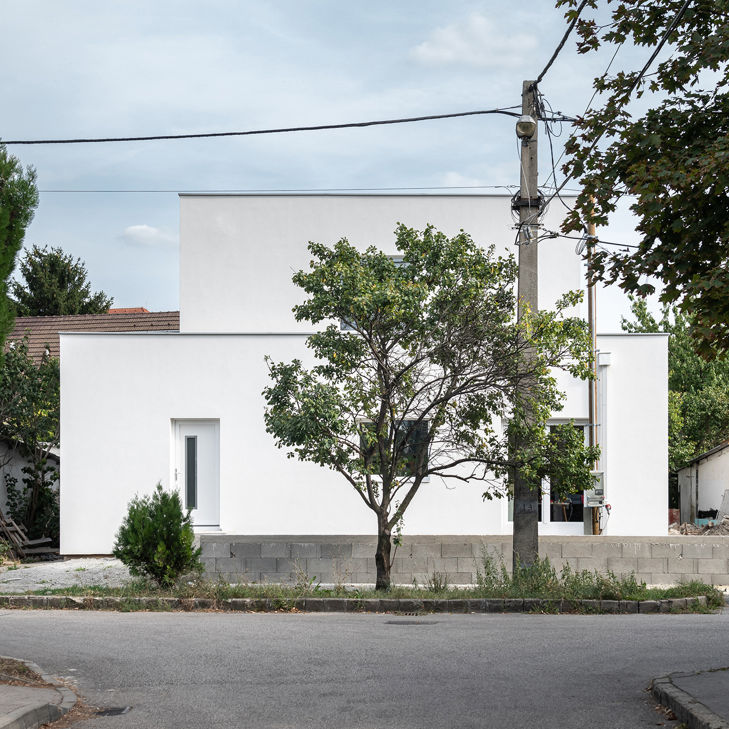 Csilla and Zsombor contacted our office to expand their existing house. Keeping the ground floor contour unchanged was an important consideration as the plot was overbuilt and the additional square meters gained by acquired rights were claimed by the investors. It was also an interesting starting point to define the construction area, as the house in the twin-style building zone does not have a pair. Defining the front garden, side garden and back garden together with the construction department, it was recognized that the three boundary walls of the ground floor were located outside the construction site, so the reconstruction of the planned high-pitched roof proved to be an impossible solution. A new lightweight level that cannot be built on existing load-bearing walls has been designed as an extension with a connection to the ground floor mass with a large airspace. The final mass formation is a good example of when the rules draw the house. The plastered masses are new, fresh spots on the street.